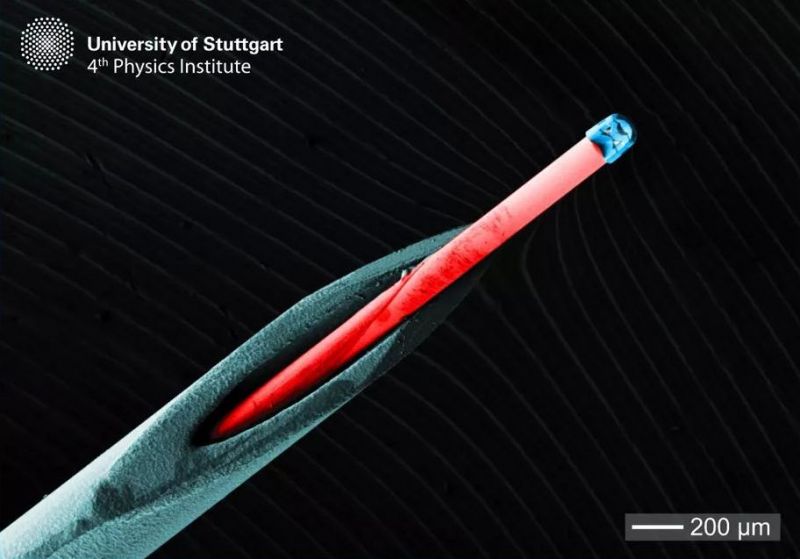 Araştırmacılar, 3 boyutlu yazıcılar kullanarak, optik mikroskoplar için 125 mikrometre çapa sahip görüntüleme bileşenleri ürettiler ve bunu 2 tel insan saçının kalınlığına eşit çaptaki bir fiber optik kabloya bağlamayı başardılar. (Kaynak: Stuttgart Üniversitesi, 4. Fizik Enstitüsü)